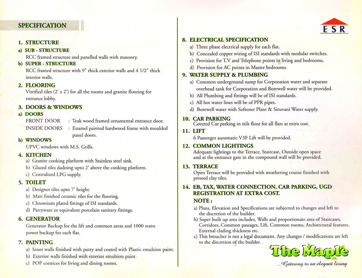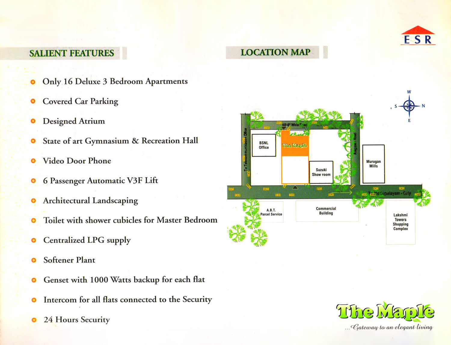 ESR's THE MAPLE is an exclusive 16 Deluxe 3 Bedroom Apartment off Mettupalayam road, Coimbatore located at the heart of the city with close proximity to educational institutions, hospitals and shopping complex. Utmost care has been taken to provide the right mix of utility and aesthetics.